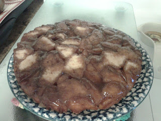 Cut biscuits in quarters. Roll in sugar and cinnamon mixture. Place in greased pie pan. Stir together topping ingredients and bring to boil. Pour over the pieces in pie pan. Bake at 350° for 20-25 minutes. Let stand for 5 minutes then remove from pan.